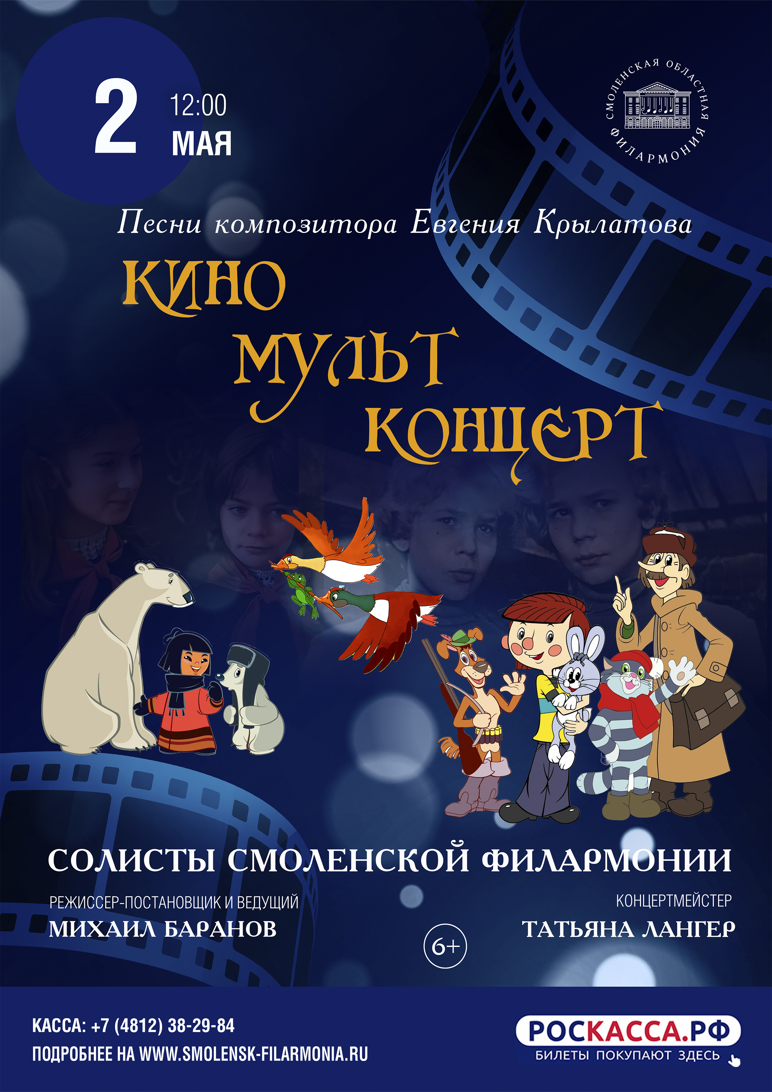 Приглашаем юных зрителей и их родителей на премьеру детской музыкальной программы "Кино Мульт Концерт", посвященной памяти и творчеству одного из самых выдающихся композиторов двадцатого века, потрясающего мелодиста, народного артиста России, лауреата Государственных премий СССР и России Евгения Крылатова.