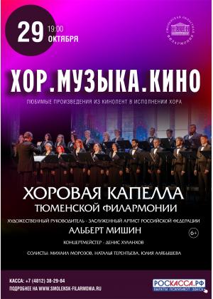Хоровая капелла Тюменской филармонии представляет программу «ХОР.МУЗЫКА.КИНО», в которую вошли мелодии, вошедшие в «золотой фонд» песенной классики. Это песни, «вторую жизнь» которым подарил отечественный кинематограф. Впервые прозвучав в кинолентах, они, однако, начали свою собственную творческую жизнь – как в быту, так и на концертной эстраде.