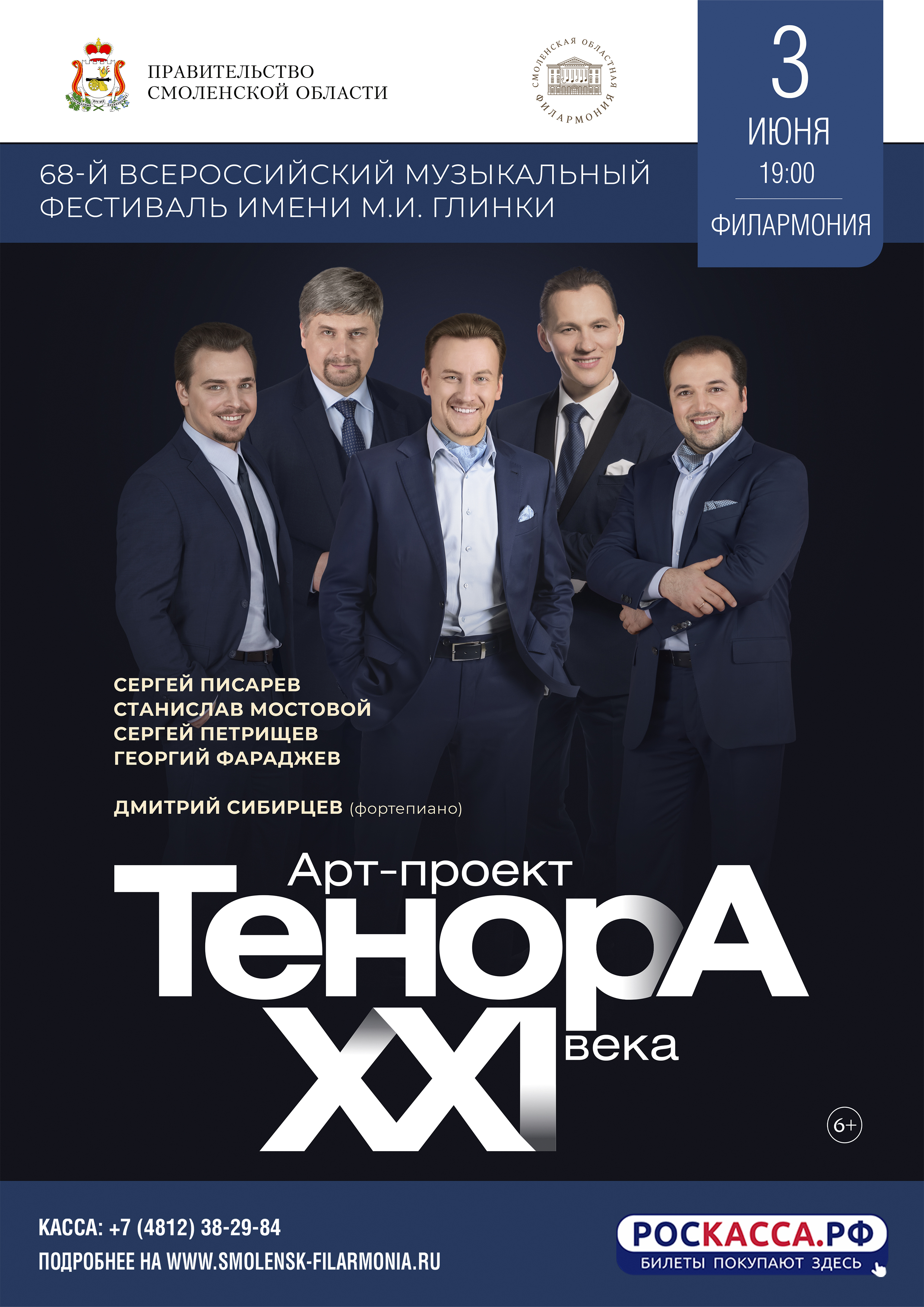 3 июня в Концертном зале Смоленской областной филармонии в рамках 68-го Всероссийского музыкального фестиваля имени М.И. Глинки свою программу представит коллектив Арт-проекта «Тенора XXI века».
