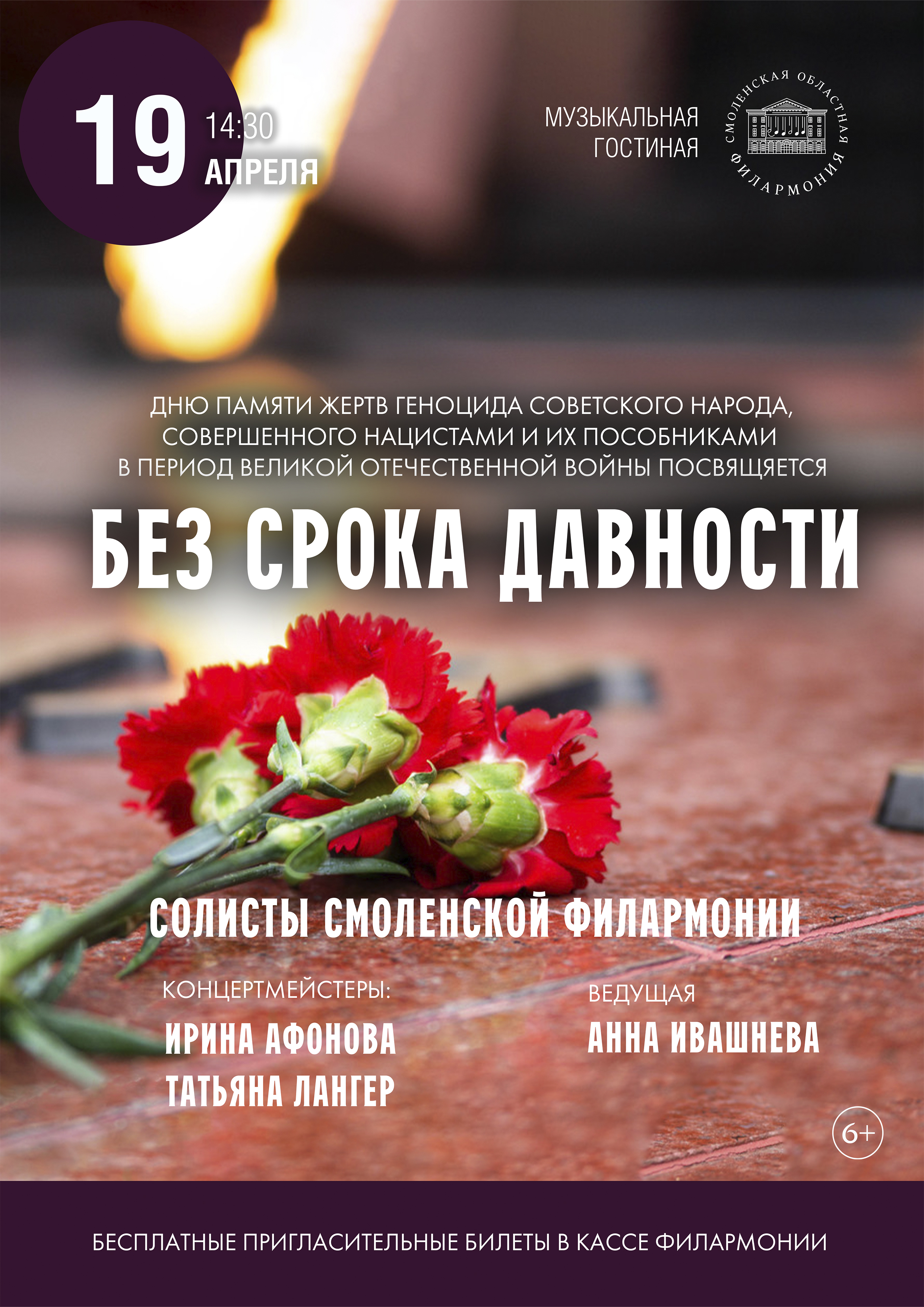 19 апреля состоится концерт "Без срока давности", посвященный Дню памяти жертв геноцида советского народа, совершенного нацистами и их пособниками в период Великой Отечественной войны.