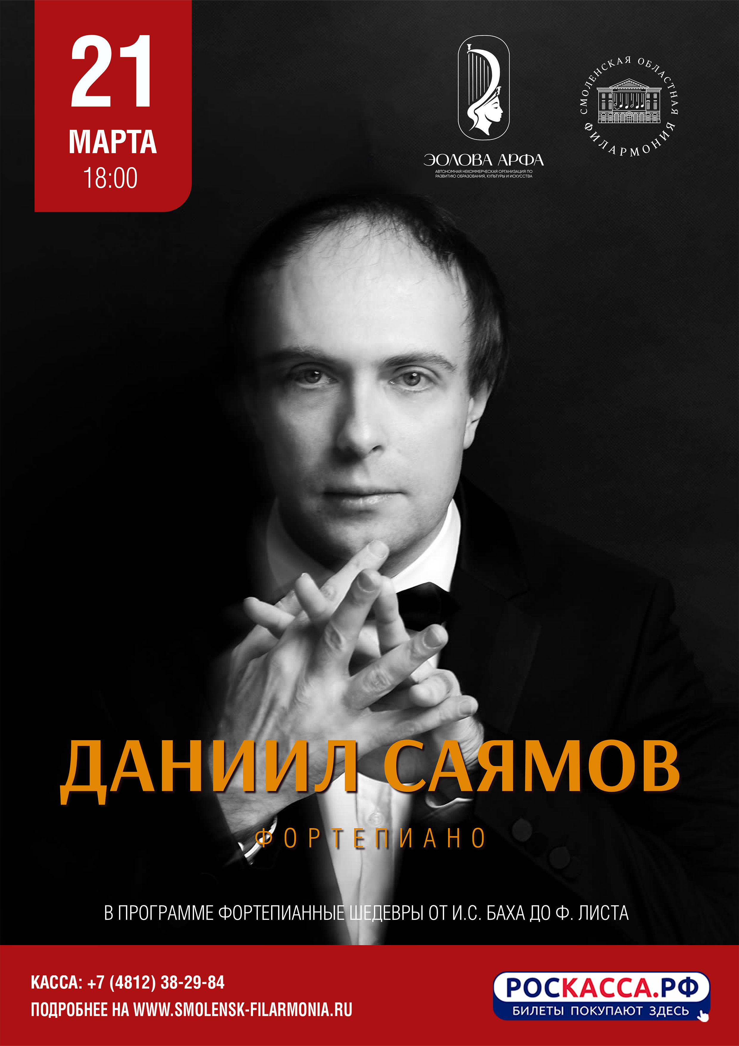 21 марта в Концертном зале имени М.И. Глинки Смоленской областной филармонии состоится сольный концерт одного из самых ярких и самобытных пианистов нашего времени – Даниила Саямова. Программа вечера станет масштабным путешествием по вершинам фортепианного репертуара: от барокко И.С. Баха через романтизм И. Брамса к философской глубине Н.К. Метнера и поэтическим транскрипциям Ф. Листа.