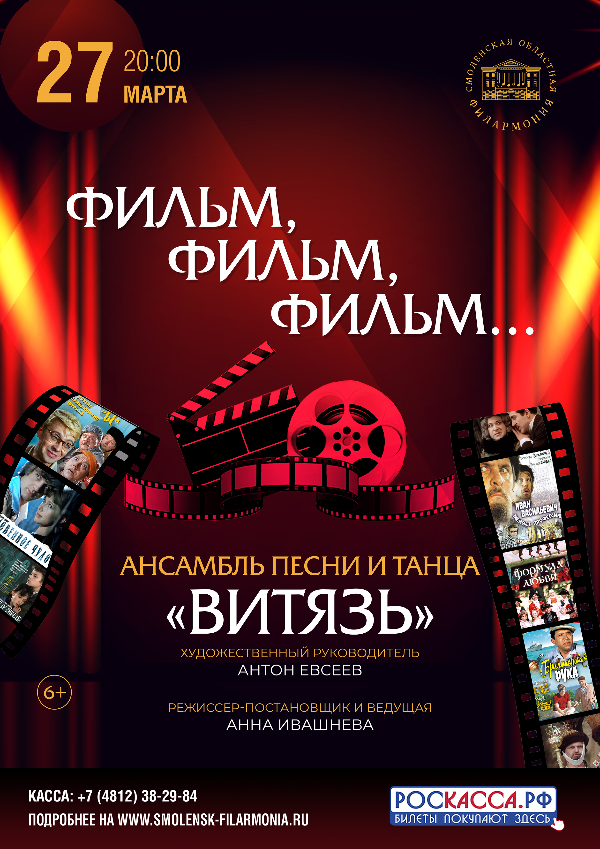 Всегда приятно пересматривать кадры, слушать песни и цитировать любимые киноленты. Смоленскому слушателю такая возможность представится. Артисты исполнят для вас самые запоминающиеся мелодии, которые перенесут слушателей в атмосферу советского кино. Не обойдется и без сюрпризов: в этот вечер вы увидите абсолютно новые хореографические номера и даже инсценировки знаменитых сюжетов. Художественный руководитель – Антон Евсеев.
