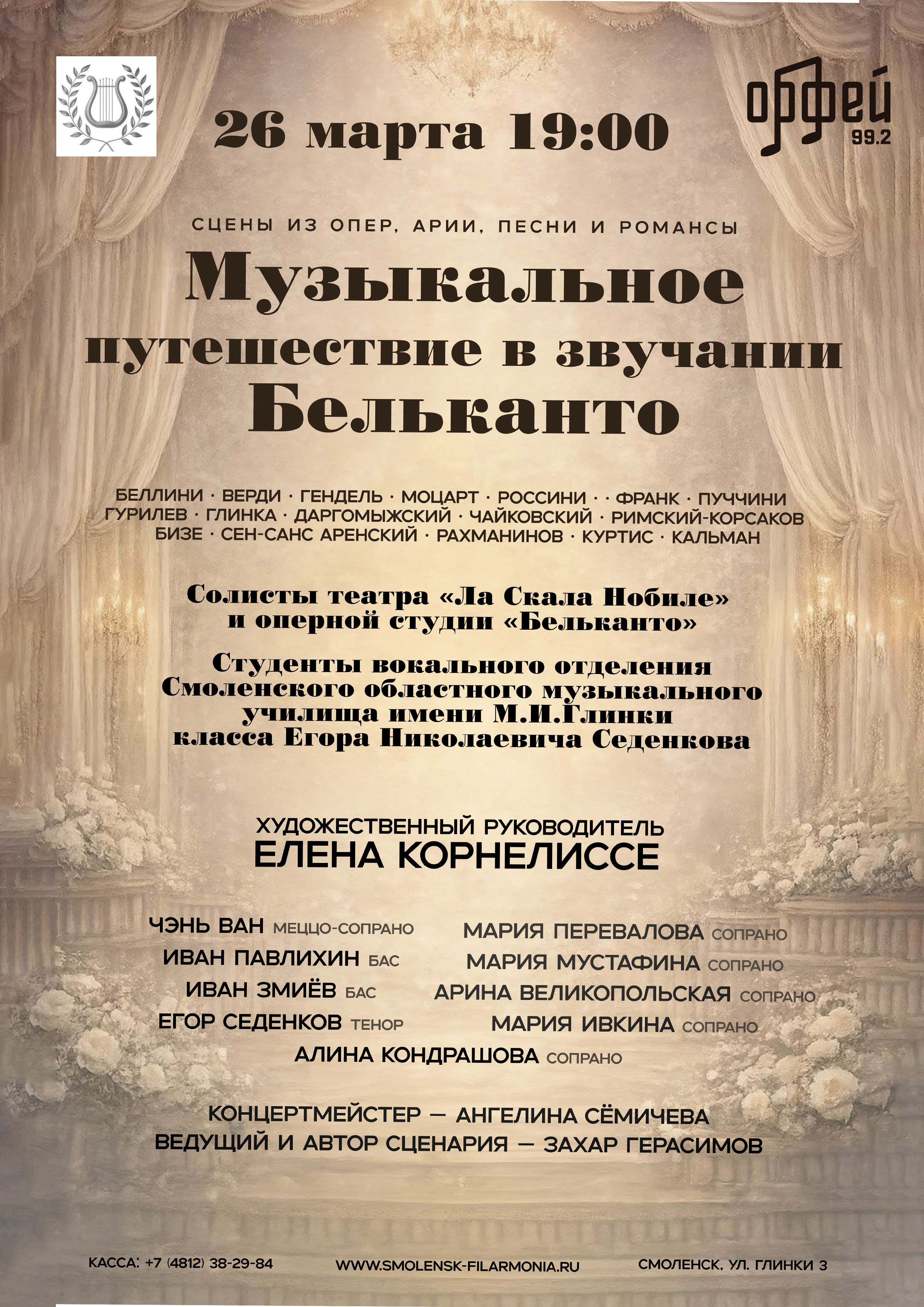 Вас ждут шедевры великих мастеров: Беллини, Верди, Гендель, Моцарт, Россини, Гурилёв, Глинка, Даргомыжский, Франк, Пуччини, Бизе, Сен-Санс, Чайковский, Римский-Корсаков, Аренский, Рахманинов, Куртис, Кальман.