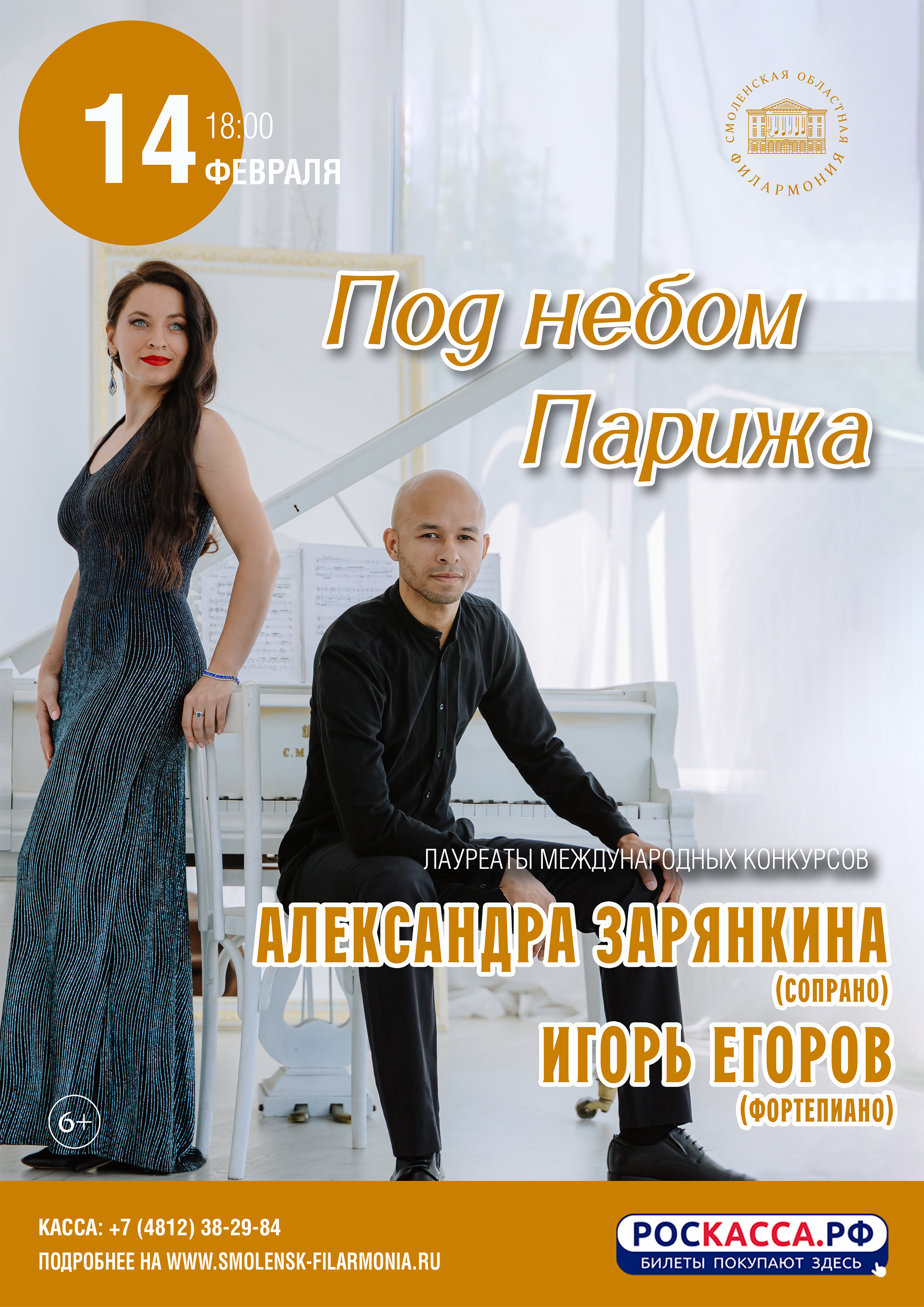 Талантливые музыканты из Санкт-Петербурга, лауреаты международных конкурсов Александра Зарянкина, обладательница тёплого драматического сопрано, и блистательный пианист Игорь Егоров приглашают вас провести зимний вечер под небом Парижа!