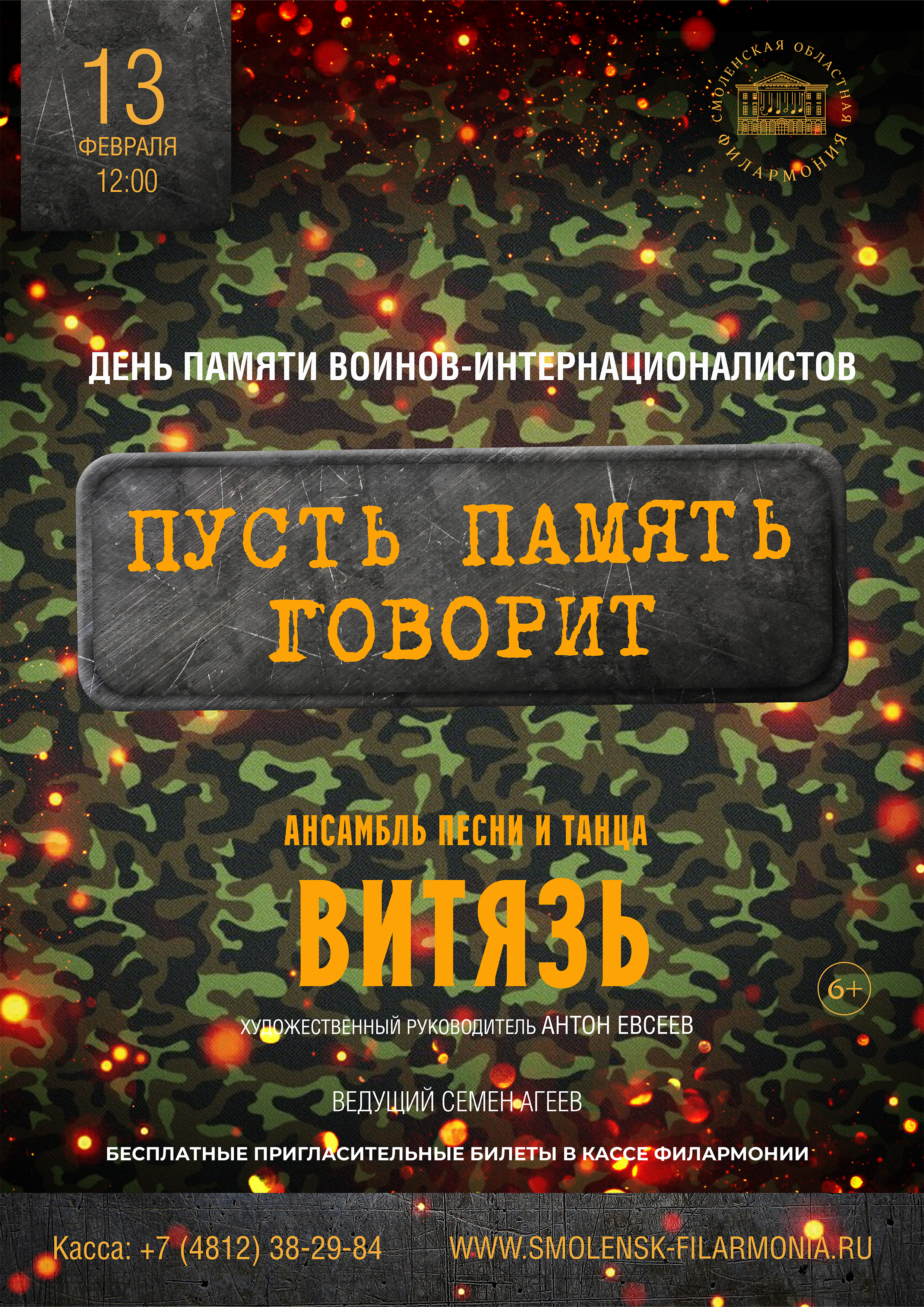 13 февраля в 12.00 в филармонии состоятся концерт ансамбля песни и танца «Витязь» «Пусть память говорит», посвященный Дню памяти воинов-интернационалистов.