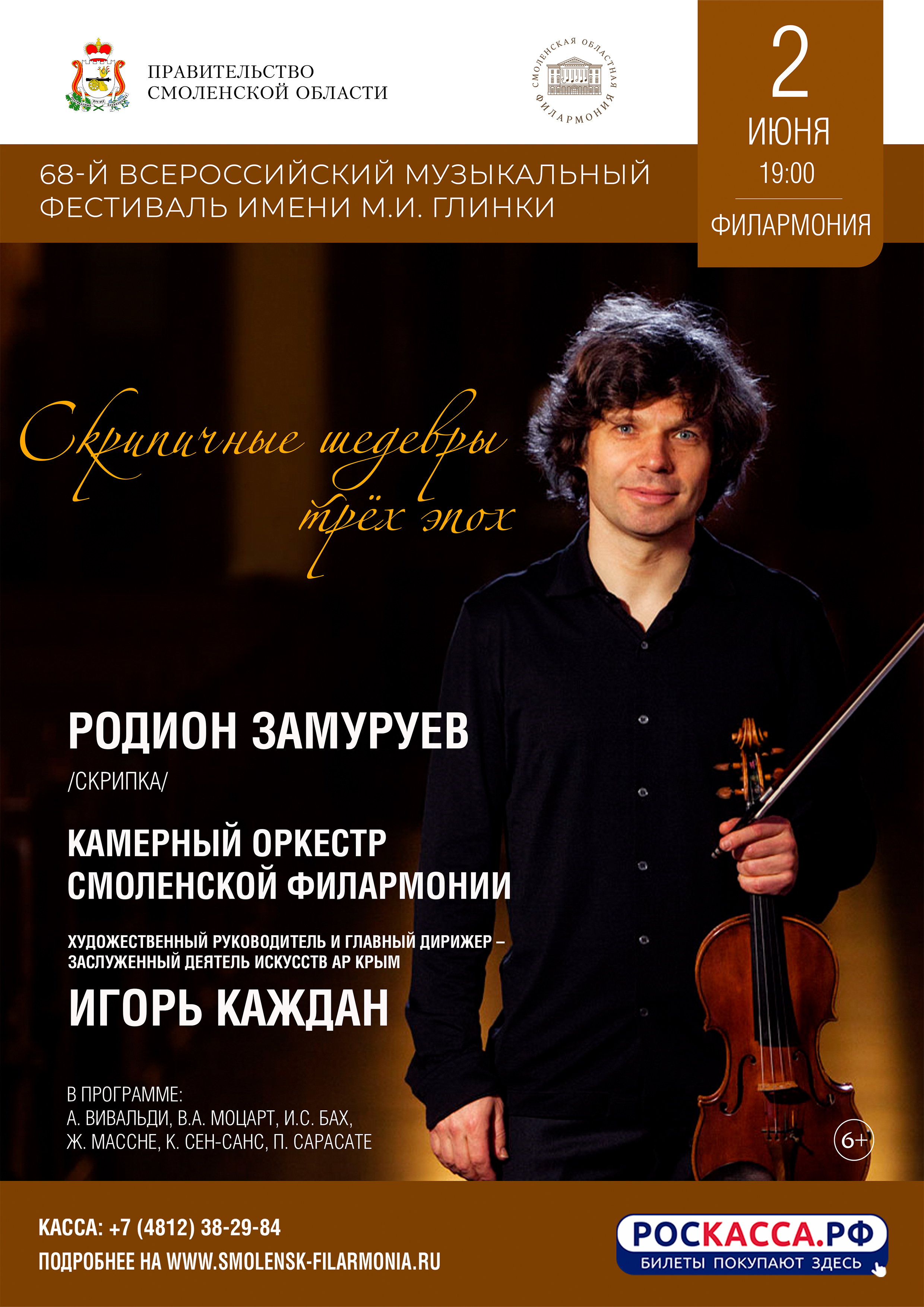 2 июня в рамках 68-го Всероссийского музыкального фестиваля имени М.И. Глинки в Смоленской областной филармонии состоится концерт «Скрипичные шедевры трёх эпох».