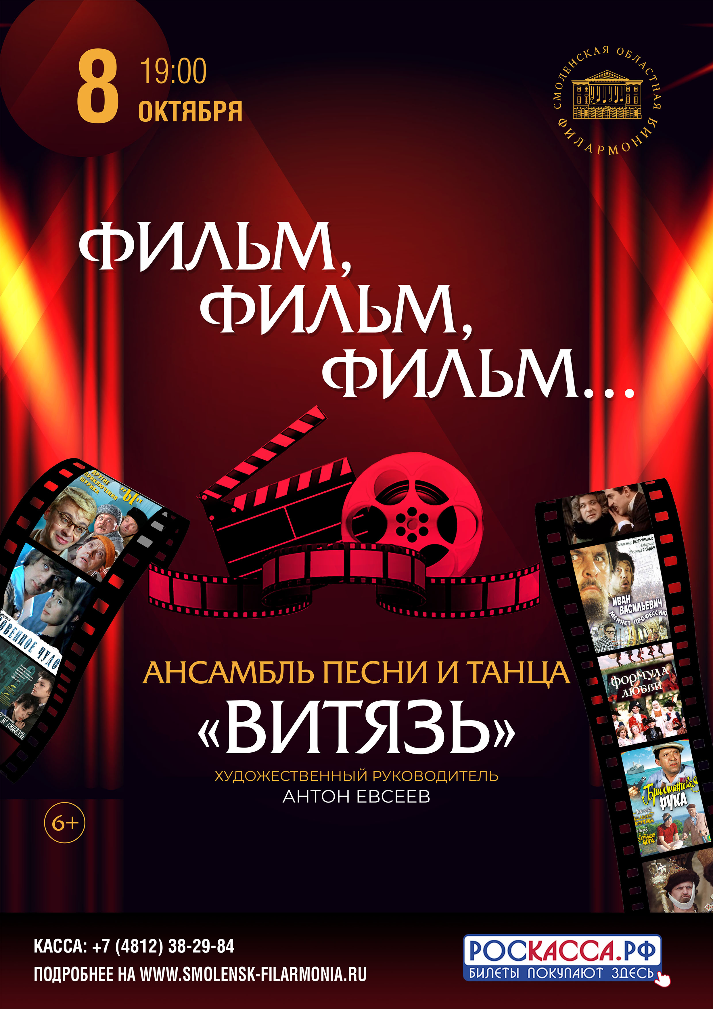 8 октября в 19.00 на сцене Смоленской областной филармонии состоится концерт-спектакль «Фильм, фильм, фильм!» в исполнении ансамбля песни и танца «Витязь».