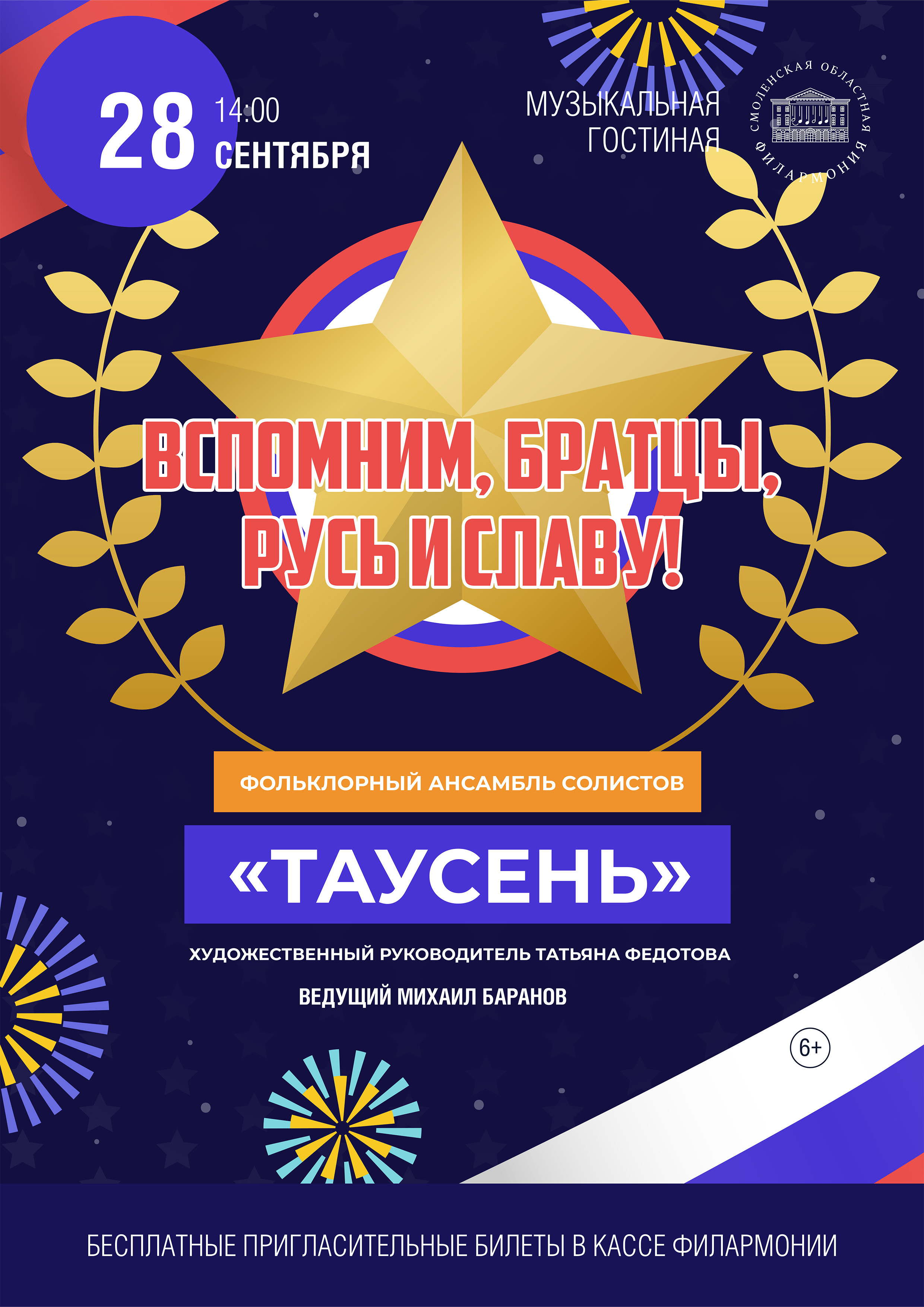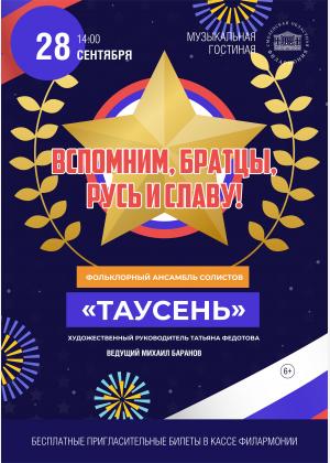 Приглашаем 28 сентября в 14.00 в Смоленскую областную филармонию на военно-патриотическую концертную программу «Вспомним, братцы, Русь и славу!», составленную из солдатских исторических песен разных жанров и разных времён, в исполнении фольклорного ансамбля солистов «Таусень», художественный руководитель Татьяна Федотова. На театрализованном фольклорном концерте артисты исполнят песни военных лет XVIII - XX веков, отражающие отношение народа к тяготам войны и горю потерь.