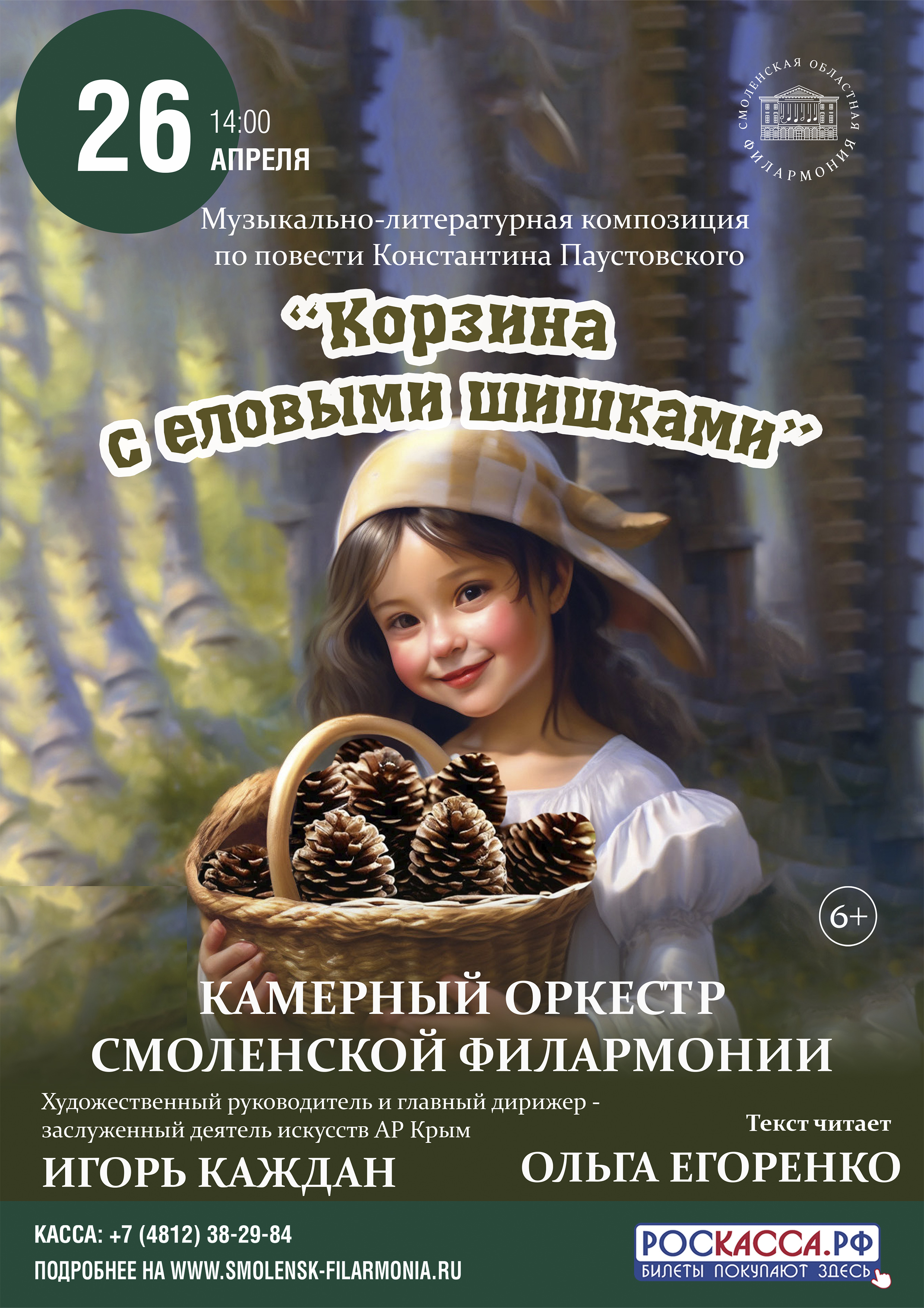26 апреля на сцене Концертного зала имени М.И. Глинки Камерный оркестр Смоленской филармонии под управлением дирижёра заслуженного деятеля искусств АР Крым Игоря Каждана представит музыкально-литературную композицию по новелле Константина Паустовского об Эдварде Григе «Корзина с еловыми шишками».