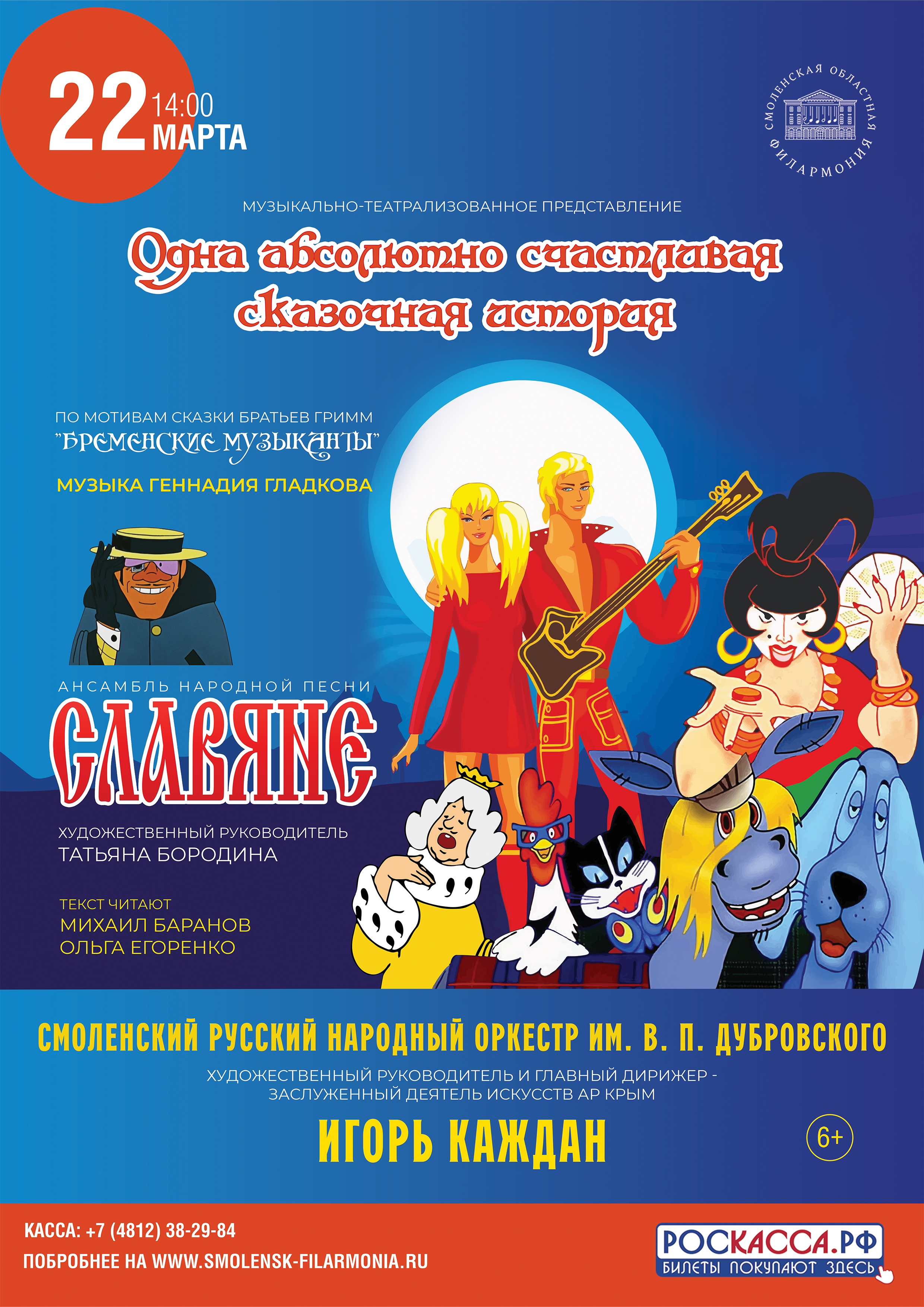 Знакомая и всеми любимая история не оставит равнодушными юных любителей музыки. Праздник музыки и сказки подарят артисты Смоленского русского народного оркестра имени В.П.Дубровского, Художественный руководитель и главный дирижер - Заслуженный деятель искусств АР Крым - Игорь Каждан и ансамбль народной песни "Славяне"
