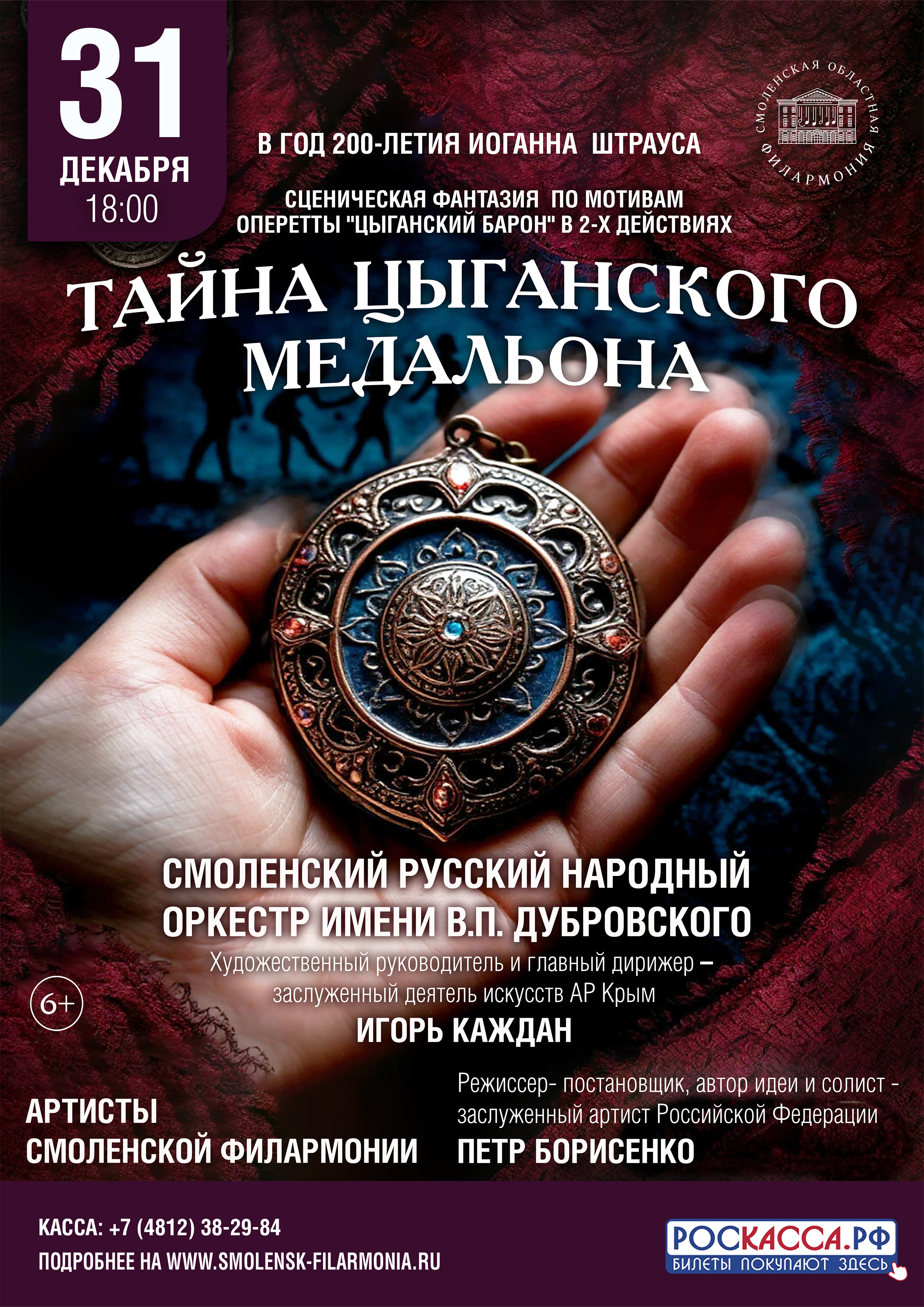 31 декабря в 18.00 Смоленская областная филармония приглашает вас на новогодний концерт-сценическую фантазию «Тайна цыганского медальона» по мотивам оперетты Иоганна Штрауса «Цыганский барон»!