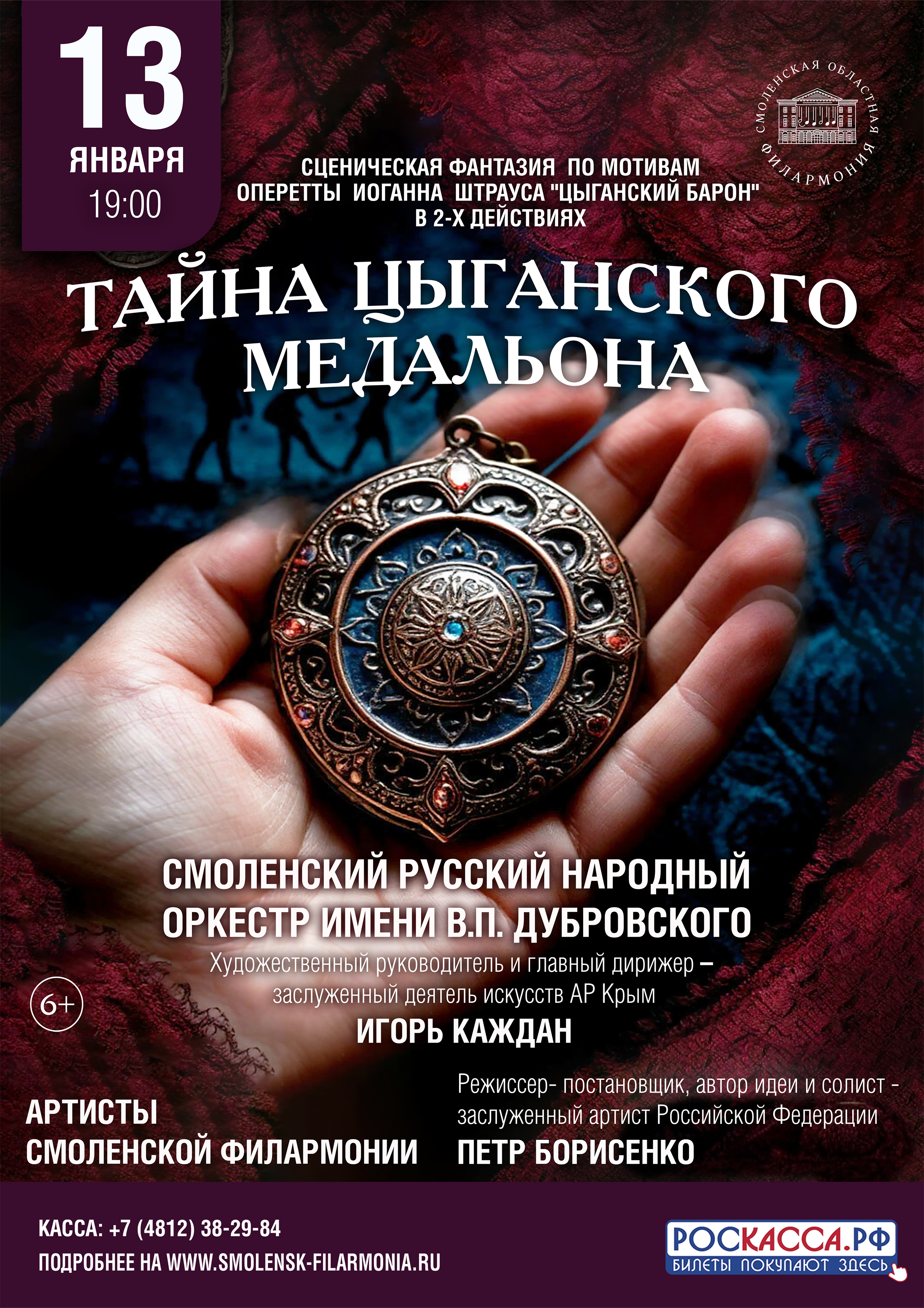 13 января, на «Старый Новый год», Смоленская областная филармония приглашает вас на новогодний концерт-сценическую фантазию «Тайна цыганского медальона» по мотивам оперетты Иоганна Штрауса «Цыганский барон»!