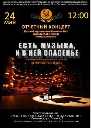 24 мая в 12:00 на сцене Смоленской областной филармонии состоится отчетный концерт «Есть музыка, и в ней спасенье» обучающихся и преподавателей Детской музыкальной школы №1 имени М.И. Глинки. Концерт пройдёт в рамках общешкольного проекта «Олимп успеха», подводя итоги 2025-2026 учебного года.