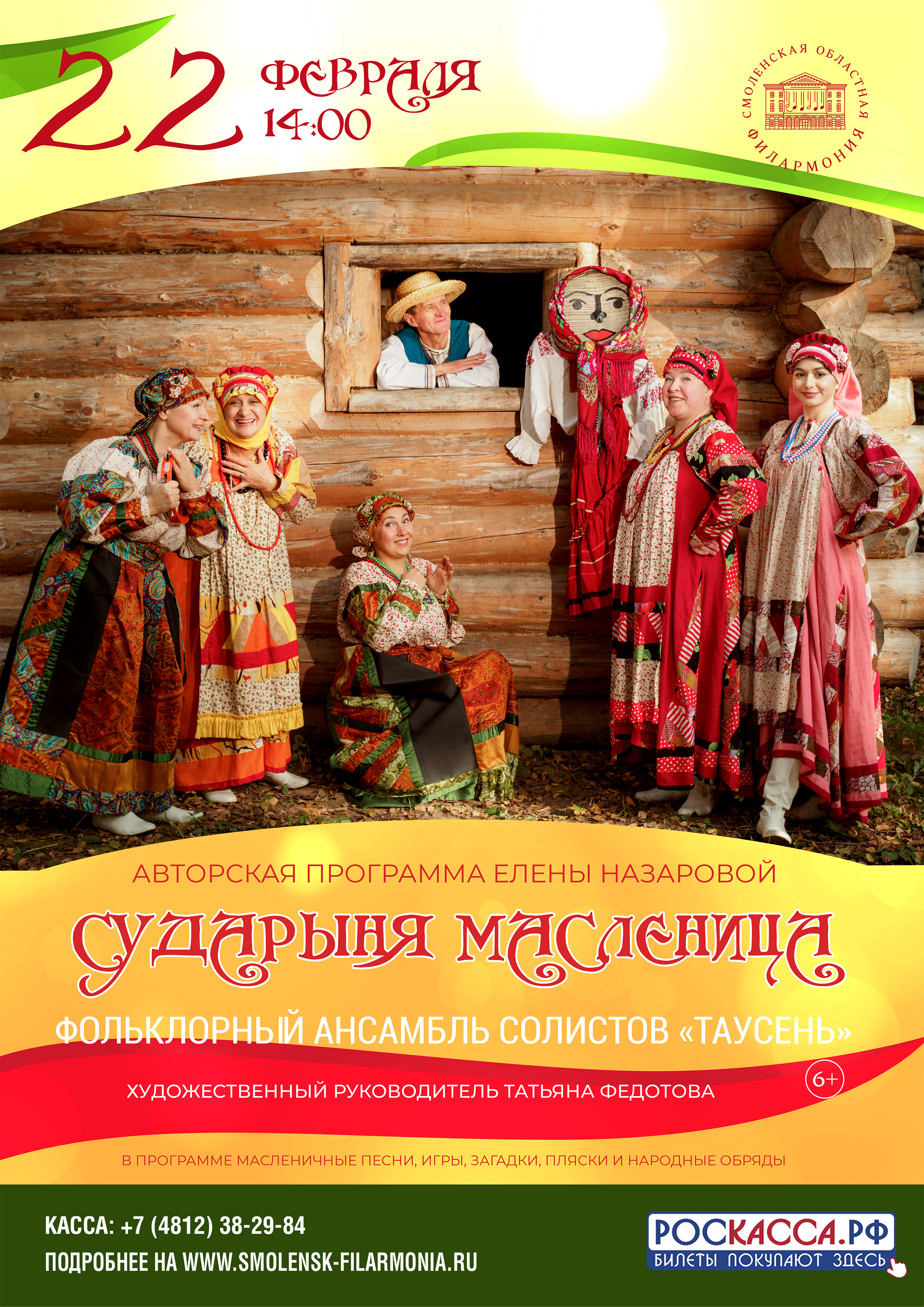 22 февраля, в завершающий праздничный день, приглашаем проводить Масленицу в зале Смоленской областной филармонии вместе с фольклорным ансамблем солистов «Таусень», художественный руководитель Татьяна Федотова.