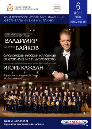 6 июня в 18.00 в Смоленской областной филармонии состоится концерт Смоленского русского народного оркестра имени В.П. Дубровского под управлением художественного руководителя и главного дирижёра – заслуженного деятеля искусств АР Крым Игоря Каждана с солистом – оперным певцом, лауреатом международных конкурсов, лауреатом премии Фонда Ирины Архиповой, солистом Большого театра России Владимиром Байковым (бас-баритон).
